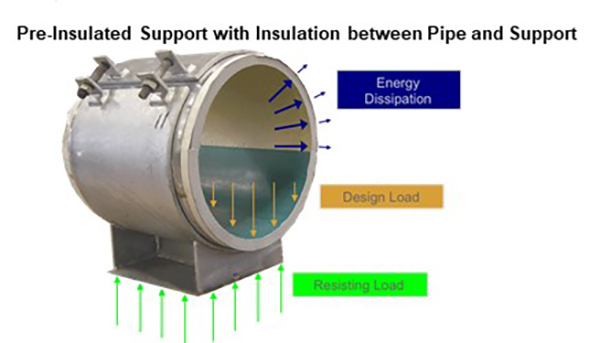 There are two approaches to pre-insulated shoes, as shown below. You can either insulate between the pipe and the pipe support or you can insulate between the pipe support and the structure.