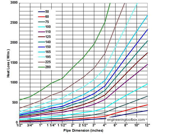 In addition to insulation limiting the thermal energy transferred to the pipe support or structure, exposed steel loses thermal energy to air. For example, the chart below heat loss from steel pipe based on the pipe dimension and temperature difference between the pipe and air. Under MSS code, steel supports lose 100° F per inch as measured from the outer wall of the pipe.